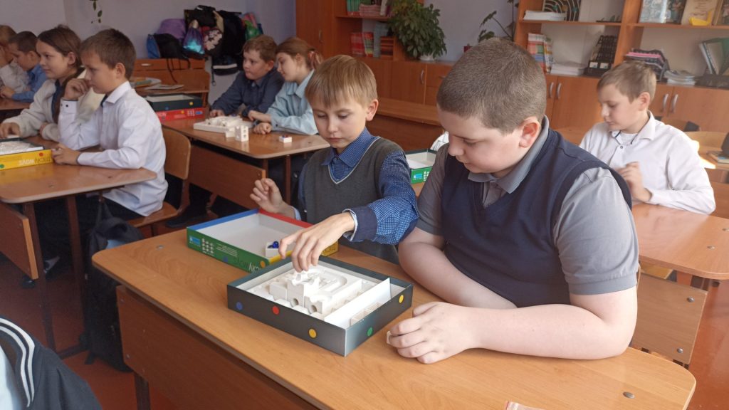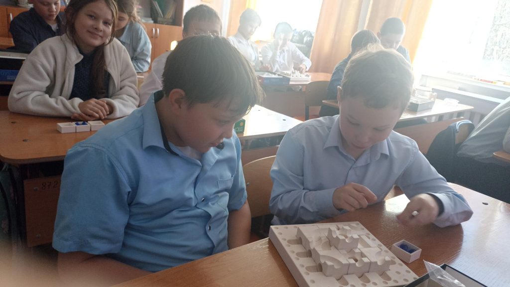 Первое знакомство детей с игрой состоялось в декабре прошлого года, продолжилось в 2025 году. В ходе занятия, которое состоялось 14 октября, каждому участнику нужно было построить самый длинный путь для шарика от пустого поля (стартовая башня) до финишного, допуская до трех изменений за один ход, после хода каждого игрока ситуация, положение кубиков на поле менялось. Ребята играли с интересом. Как построить траекторию, которая будет работать? Где поставить маленький кубик, чтобы он стал отправной точкой гениального маршрута?